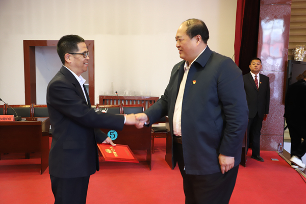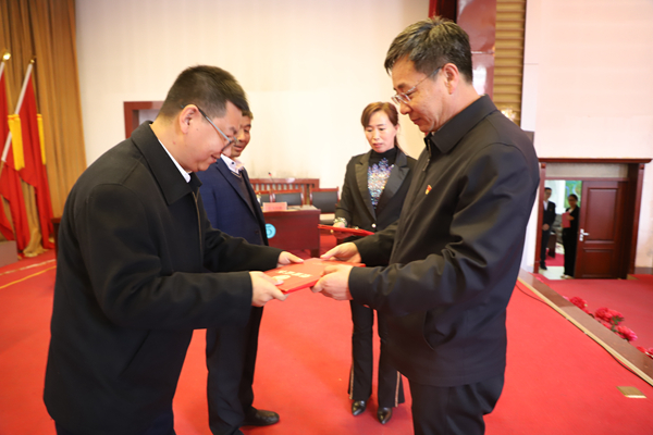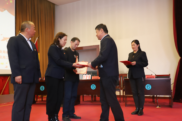 阿木爾林業(yè)局黨委書記胡守慶(右)為獲得第一名代表隊頒發(fā)榮譽證書。