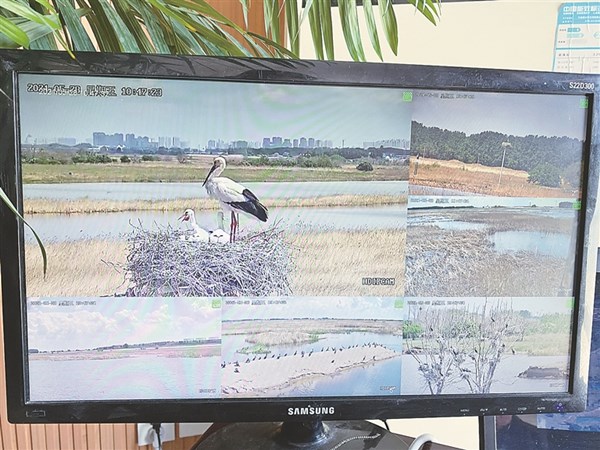 監(jiān)測(cè)平臺(tái)顯示器中的東方白鸛一家。