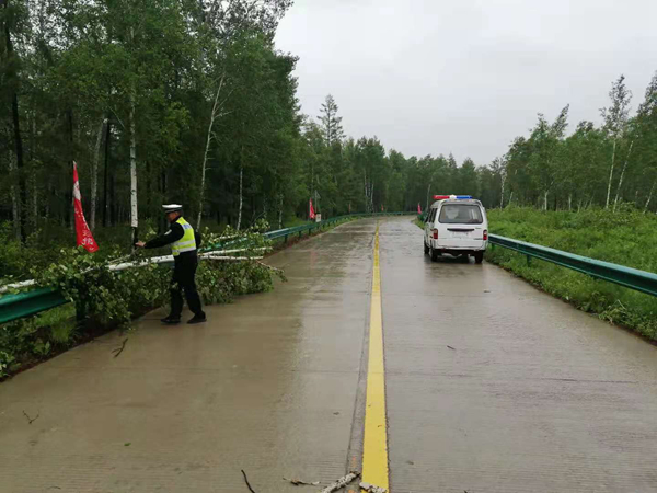 交警大隊派出警力增援北極中隊,擴大巡邏范圍,及時排查發(fā)現(xiàn)G111、G331國道、景區(qū)周邊路段交通隱患。在北極村至北紅村路段,發(fā)現(xiàn)由于暴雨沖刷,該路段3處山石、樹枝堆積在路面,2處樹木刮倒,嚴(yán)重影響路面通行安全。巡邏民警立即對險情進行處置。針對3處漫水較為嚴(yán)重區(qū)域,設(shè)置警戒線等警示標(biāo)志,告知過往車輛通行路況,提醒車輛減速慢行,同時通知相關(guān)部門及時處置。