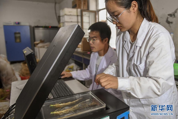 8月2日,在吉林省梨樹縣四棵樹鄉(xiāng)三棵樹村“科技小院”,中國農(nóng)業(yè)大學博士研究生沙野(左)和在讀碩士郭雯清掃描玉米根系樣本。