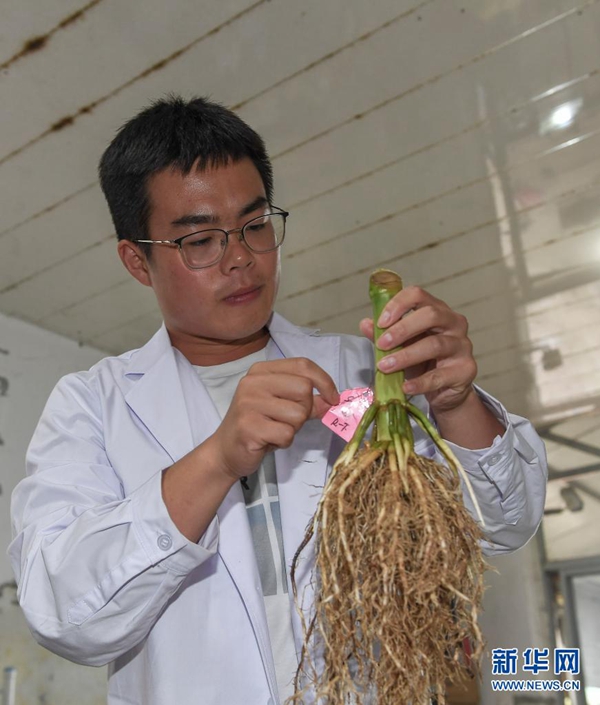 8月2日,在吉林省梨樹縣四棵樹鄉(xiāng)三棵樹村“科技小院”,中國農(nóng)業(yè)大學博士研究生沙野觀察玉米根系樣本。