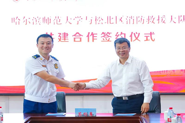 雙方代表簽署《哈爾濱師范大學(xué)與松北區(qū)消防救援大隊(duì)共建合作框架協(xié)議書》