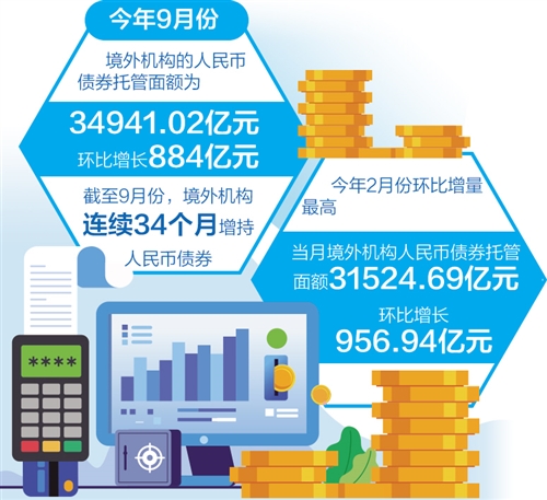 境外機(jī)構(gòu)對(duì)人民幣債券熱情持續(xù)高漲。數(shù)據(jù)顯示,9月份境外機(jī)構(gòu)人民幣債券托管面額為34941.02億元,較8月份增加884億元,環(huán)比增量創(chuàng)今年3月份以來新高。截至9月份,境外機(jī)構(gòu)已連續(xù)34個(gè)月增持人民幣債券。