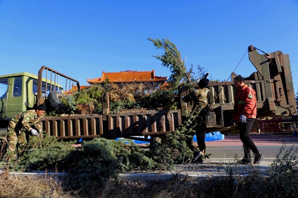 圖為阿木爾林業(yè)局森林消防大隊專業(yè)撲火隊員將修剪下來的樹枝裝車運走(王力/攝)
