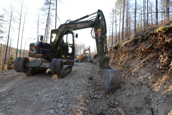 圖為阿木爾林業(yè)局多種經(jīng)營公司利用大推機械設備平整2—1線新開通路面(王力/攝)