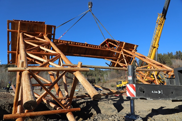 早上10點58分,只見平靜的林業(yè)局薩布素軍馬場頓時熱鬧了起來,兩臺大型起重機發(fā)動機嗡嗡作響,一東一西緩慢吊起10多噸重的大門,因偏向一側首次作業(yè)沒有成功。安裝技術人員調(diào)整重心點,第二次試舉,并在一臺裝載機的協(xié)助下,調(diào)整機位,歷時2個多小時,才將具有濃郁驛站文化風格的高10米、寬14米的木質(zhì)大門,矗立在平地上。