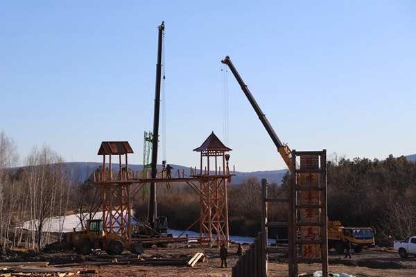 阿木爾林業(yè)局薩布素景區(qū)的薩布素軍馬場大門被緩緩起吊起來(王力/攝)