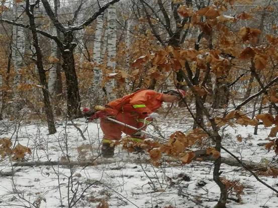 在經(jīng)過一段緊張嚴格的產(chǎn)前技能及安全培訓(xùn)后,紅星林場職工們備齊生產(chǎn)工具和防護物品,每天頂著未褪盡的夜色出發(fā),天剛冒亮就開工,在積雪覆蓋的林間不停穿行,鋸手手持割灌機把作業(yè)規(guī)程要求的各類林內(nèi)枯死、風折枝干伐除,后面的歸堆工緊隨其后,把割下的枯干枝條有序的理順碼成堆。各小組分工明確,配合嫻熟,漫山雜亂的倒木藤條在工人們的手下被梳理的清晰利落,寂靜的山林也在機器的轟鳴和工人們的笑聲中熱鬧起來。