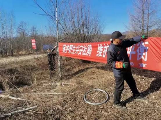 圖為新林林業(yè)局新林林場工作人員在懸掛保護野生興安杜鵑條幅(楊光 攝)