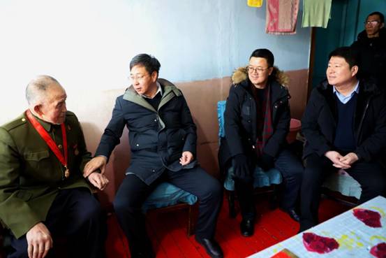 阿木爾林業(yè)局黨委副書記、局長(zhǎng)韓鳳泉(左二)走訪慰問抗美援朝老戰(zhàn)士、退休老黨員張俊峰(左一)(王力 攝)