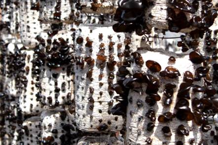塔河林業(yè)局塔林林場木耳基地大棚內(nèi)的木耳(段明琦 攝)