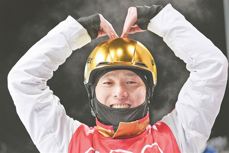 2月16日,中國選手齊廣璞比賽后慶祝。新華社記者 薛玉斌 許暢攝