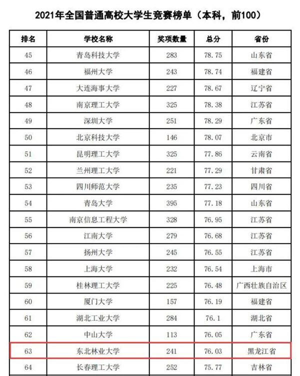 黑龍江經(jīng)濟(jì)網(wǎng)訊(黑龍江日?qǐng)?bào)全媒體見(jiàn)習(xí)記者董廣碩 商祺)近日,中國(guó)高等教育學(xué)會(huì)高校競(jìng)賽評(píng)估與管理體系研究工作組發(fā)布2021全國(guó)普通高校大學(xué)生競(jìng)賽分析報(bào)告,在《2017-2021年農(nóng)林類本科院校大學(xué)生競(jìng)賽排行榜TOP20》中。東北林業(yè)大學(xué)以總分74.87(獲獎(jiǎng)604項(xiàng))的優(yōu)異成績(jī)連續(xù)四年蟬聯(lián)榜首。