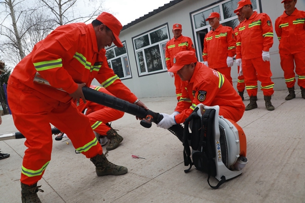 阿木爾林業(yè)局依東林場專業(yè)撲火隊員在進行拆解安裝風力滅火機比賽(王力 攝)