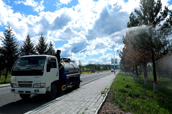 阿木爾林業(yè)局病防站利用噴霧車對樟子松綠化樹木進(jìn)行病蟲害防治(王力 攝)
