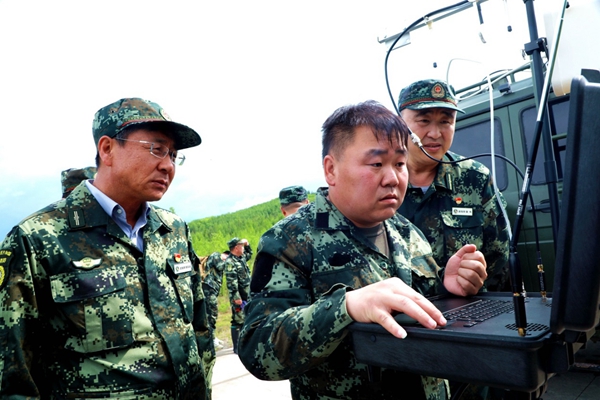 阿木爾林業(yè)局黨委副書記、局長、局防指總指揮韓鳳泉(左二)在查看無人機(jī)狀況(王力 攝)