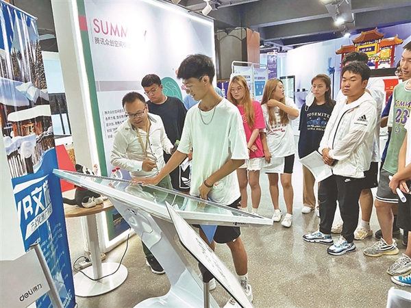 學生體驗虛擬現(xiàn)實展品。
