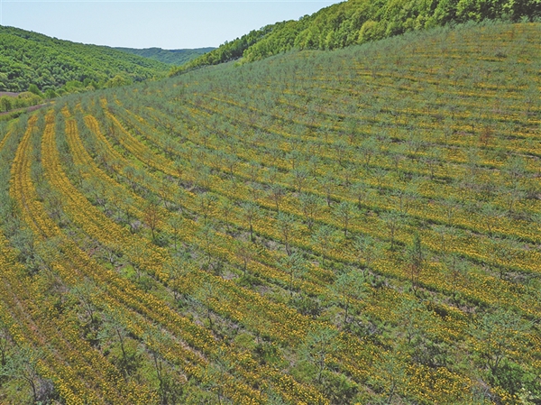 沿著公路,中藥材種植基地呈現(xiàn)一片花海:大片芍藥已經(jīng)開花,白的粉的隨風(fēng)飄搖;千畝黃芩都已經(jīng)3歲,仿佛綠蘿緞一直蔓延到遠(yuǎn)方的山坡;萬(wàn)畝沙棘谷,更像一幅水墨畫,剛露頭的沙棘果盡顯萌態(tài);樹下間作的蒲公英盛開著黃色的小花;紫的泛黑的藍(lán)靛果吸引一群群鳥兒不停來(lái)啄食……
