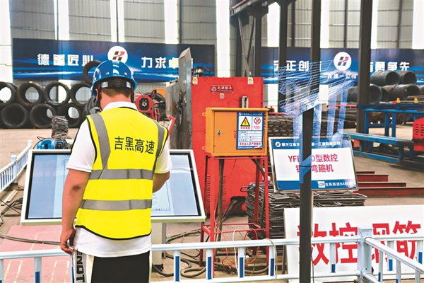鋼筋加工車間里一處3D立體投影,讓工人們可以直觀看到自己加工后的構(gòu)件將用于整體鋼筋骨架的哪個(gè)部位。任書法說,吉黑高速項(xiàng)目打造智慧梁廠,采用了數(shù)控鋼筋滾焊機(jī)、數(shù)控鋼筋剪切生產(chǎn)線、數(shù)控鋼筋彎曲中心+自動(dòng)上料配套等設(shè)備,以前這么大的加工廠要30多人,現(xiàn)在只需一半的人力,就能干出兩倍的工作量,極大提高了施工精度和效率。