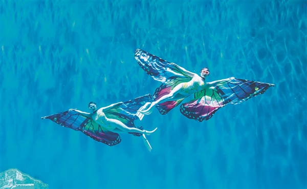 哈爾濱極地公園的水舞秀表演會聚國內(nèi)頂級水舞表演藝術家,汲取花樣游泳、芭蕾舞、形體藝術的精華。演員不僅需要克服6米深海水的巨大浮力,還要克服相當于陸地上12倍的巨大阻力,在0.5秒內(nèi)展開4米長的巨大蝴蝶羽翼,閉氣空潛3分鐘,完成一系列“蝶舞”動作,難度極高!炫彩的羽翼、波光粼粼的海水、五彩斑斕的魚兒融合在一起,美輪美奐。