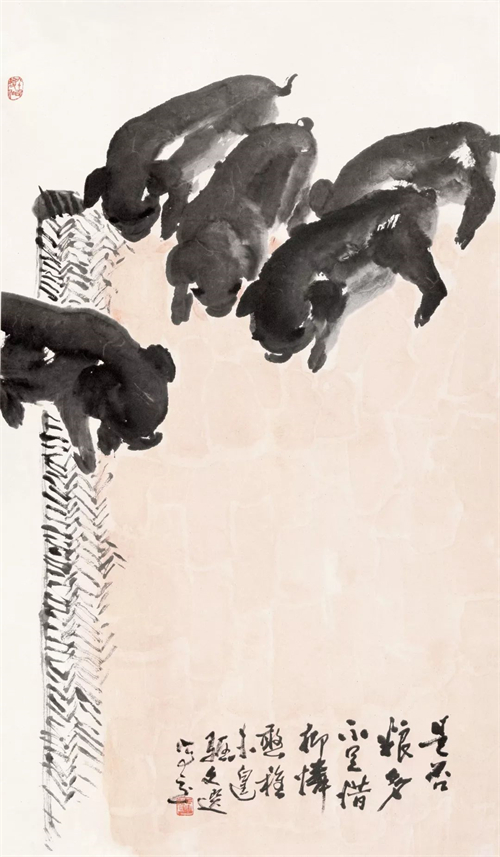 湯文選的人物、山水、花鳥(niǎo)、墨虎等一系列作品,融會(huì)著、貫穿著“三種傳統(tǒng)”。或隱或顯,或化解之,或凝聚之,或熔裁之,或獨(dú)造之。“三種傳統(tǒng)”,可概括為現(xiàn)實(shí)主義在中國(guó)畫(huà)發(fā)展歷程中的三段式,亦曰交叉出現(xiàn)的不同歷史內(nèi)涵、文化反映的三種藝術(shù)狀態(tài):首先,是古代現(xiàn)實(shí)主義傳統(tǒng)——“外師造化,中得心源”。其二,是“五四”現(xiàn)實(shí)主義傳統(tǒng)——融合西法,崇尚寫(xiě)實(shí)。其三,是新中國(guó)成立后倡導(dǎo)的革命現(xiàn)實(shí)主義傳統(tǒng)。深入火熱斗爭(zhēng),深入工農(nóng)兵。學(xué)習(xí)延安木刻,學(xué)習(xí)民間年畫(huà),學(xué)習(xí)蘇聯(lián)油畫(huà)現(xiàn)實(shí)主義的創(chuàng)作方法(50年代)。其后,“一手伸向生活,一手伸向傳統(tǒng)”(60年代)。在以上“三種傳統(tǒng)”的交匯點(diǎn)上,伸延出湯文選早期和中期的現(xiàn)實(shí)主義創(chuàng)作之路。湯文選中國(guó)畫(huà)藝術(shù)的現(xiàn)實(shí)主義,其主要特征為積極的入世態(tài)度,強(qiáng)烈的人文主義色彩,個(gè)性、民族性與時(shí)代性的完美統(tǒng)一,以及嚴(yán)肅的歷史使命感。