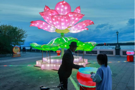 華燈初上,市民和游客紛紛“逐”光而來,圍繞在燈組旁嬉戲玩耍,拍照留念,歡聲笑語在龍鄉(xiāng)秋夜里久久回蕩。景觀燈光秀中最有設計感的應數(shù)“盛世第一蓮”燈組了,它以嘉蔭蓮化石——中國“第一蓮”為設計靈感,以蓮喻廉,借此弘揚廉潔文化。