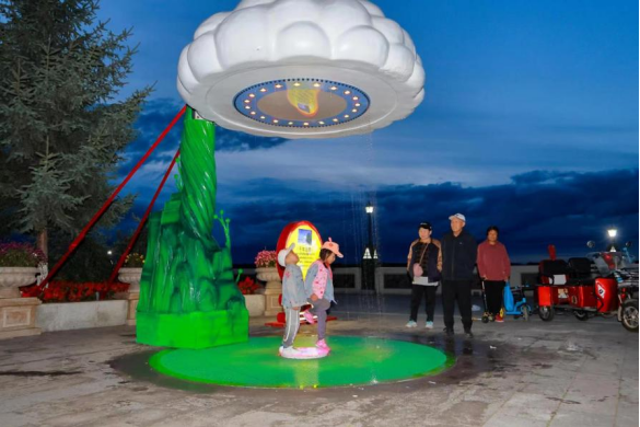 人氣最高的應數(shù)“千年云雨”燈組,運用了水流循環(huán)系統(tǒng)與燈光相結合,形成了可互動、可參與、可觀賞的趣味云雨再現(xiàn),引發(fā)人們對千年前恐龍時代自然天象的無限聯(lián)想,體現(xiàn)了古與今一脈相承、生靈與自然和諧共處。