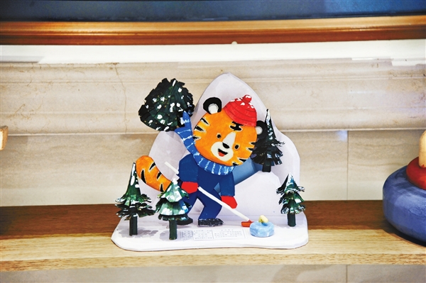 這是學(xué)生們制作的手工藝品“愛玩冰壺的小老虎”。(胡錫韋/攝)