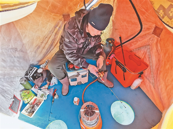 比賽現(xiàn)場(chǎng),冰面上色彩各異的帳篷錯(cuò)落排開,來自我省東部地區(qū)多個(gè)地市的70名釣魚愛好者聚集在此,感受垂釣魅力。當(dāng)日室外最低溫度零下20℃,而冰釣帳篷內(nèi)卻是熱氣騰騰。選手們用小火爐取暖,調(diào)料、打窩,各展技藝,不一會(huì)兒都收獲頗豐。