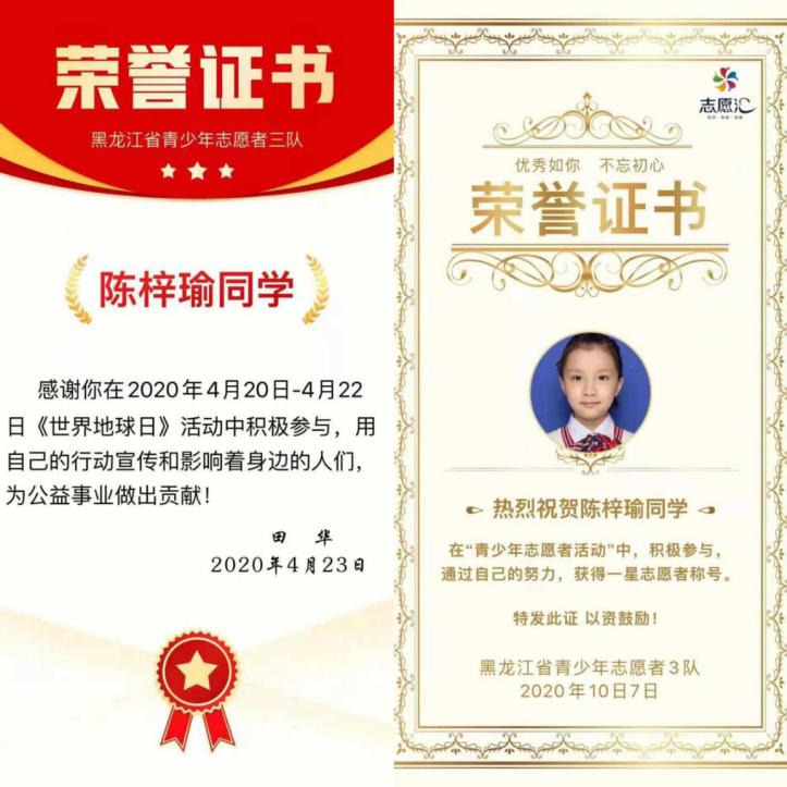 她在志愿服務(wù)中不怕苦不怕累,圓滿完成各項(xiàng)任務(wù),獲得各界一致好評(píng),先后獲得省市(區(qū))的相關(guān)表彰,并被省幫扶中心授予“愛(ài)心少年”榮譽(yù)稱號(hào)。