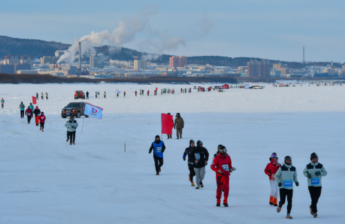 中國東極(撫遠·黑瞎子島)冰上馬拉松賽已經連續(xù)五屆在撫遠市舉辦,憑借地域唯一性和極限挑戰(zhàn)性,成為全球五大冰上馬拉松之一,開創(chuàng)中國極限冰雪馬拉松運動的先河。本屆賽事由黑龍江省體育局、佳木斯市人民政府主辦,省政府黑瞎子島建設和管理委員會、撫遠市人民政府承辦。中國奧委會副主席、中田協(xié)名譽主席段世杰前往比賽開幕式鳴槍。賽事設有全程馬拉松、半程馬拉松、新年歡樂跑三個項目。清晨7點,撫遠市的氣溫達到了零下23.3攝氏度,選手們紛紛帶上防風面罩、保暖帽、手套、太陽鏡、防滑冰爪等應對極端嚴寒環(huán)境下的特殊裝備,在全程42.195公里的冰賽道上,徒步穿越冰雪世界,體驗當?shù)鬲毺乇┪幕兔袼罪L情,品嘗賽道補給站提供的熱氣騰騰的鱘鰉魚鍋、鮮鯽魚湯等地方特色補給品,補充能量抵御嚴寒。