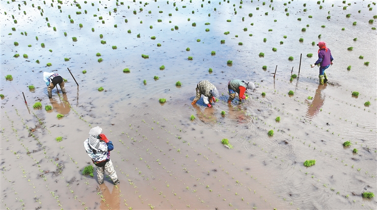 立夏過后,黑土地正式迎來水稻移栽好時節(jié),一排排秧苗整齊地挺立在田間,為稻田鋪上了“新綠”。在綏化市北林區(qū)國家級水田示范區(qū)國家級區(qū)域性良種繁育基地,這里正采用人工插秧的方式,繁育寒地香米品種。今年,北林區(qū)水稻預計種植面積108萬畝,寒地香米系列品種覆蓋95%以上。