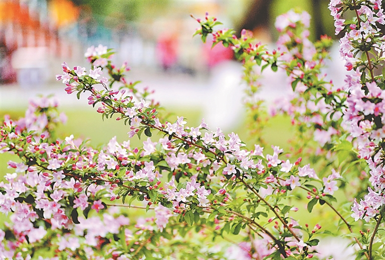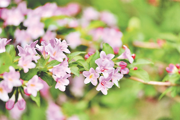 5月22日,哈爾濱市兆麟公園綠地里種植的多棵錦帶花迎風(fēng)綻放,為夏日冰城增添了更多的色彩,許多游人駐足觀看。