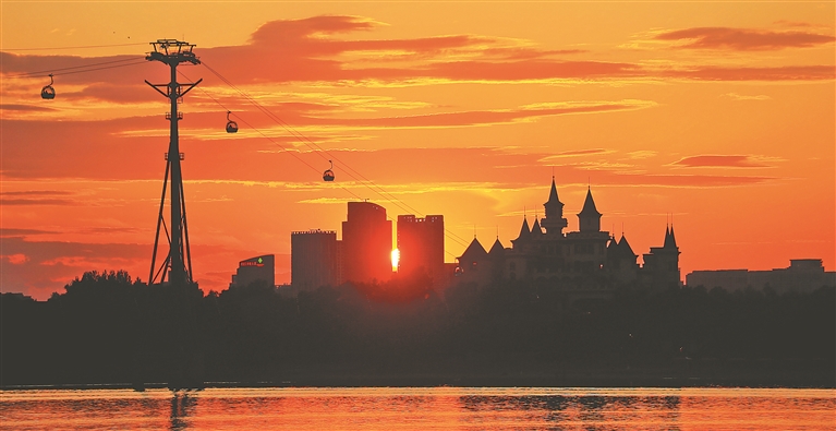 近日,初夏的松花江碧水清清、綠意盈盈,一塊塊大大小小的濕地星羅棋布,宛如一顆顆珍珠散落在松花江兩岸。傍晚,落日熔金,夕陽余暉映云成霞,游船悠悠,鷗鳥翩翩,江景如畫。