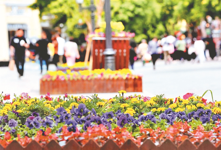 13日,哈爾濱市道里區(qū)中央大街上,行人從五彩繽紛的花卉旁走過(guò)。進(jìn)入夏季,來(lái)哈爾濱避暑游玩的游客不斷增多,為給游客打造一個(gè)舒適美麗的旅游環(huán)境,中央大街上種植了三色堇、金魚(yú)草、矮牽牛、四季海棠等多種花卉。這些鮮花姹紫嫣紅、爭(zhēng)奇斗艷,將整條街道裝點(diǎn)得十分靚麗。