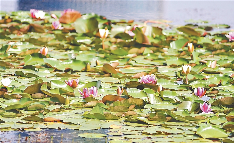 時下,位于哈爾濱市道里區(qū)的群力丁香公園人工湖內(nèi),大片的睡蓮競相綻放,吸引眾多市民和游客前來觀賞拍照。這些睡蓮花朵有白色的、粉色的、紅色的,驚艷綻放,美在當(dāng)“夏”。