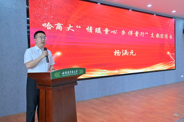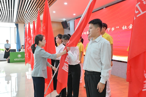 省希望工程捐助中心主任、省青少年發(fā)展基金會理事長杜晶為哈爾濱商業(yè)大學(xué)2024年“三下鄉(xiāng)”社會實踐團隊代表、“情暖童心·鄉(xiāng)伴童行”支教團代表授旗,希望即將奔赴龍江大地的志愿者們能夠充分利用服務(wù)期,向下扎根、向上生長,踐行志愿服務(wù)精神,在奉獻與收獲中積累報國為民的樸素情懷,做有理想、有擔(dān)當(dāng)?shù)男聲r代青年。