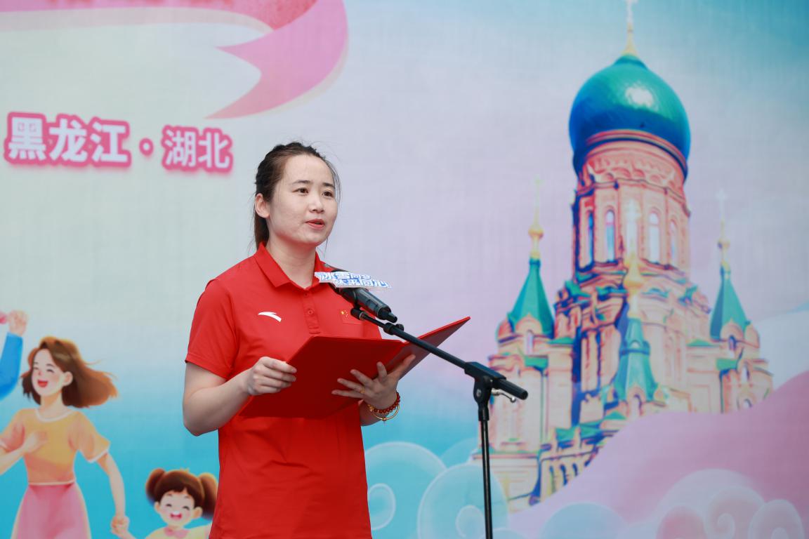 短道速滑世界冠軍孔雪進(jìn)行冠軍寄語??籽┍硎荆饺藟凼且患覟閲鵀槊竦钠髽I(yè),與她為國爭光的目標(biāo)一致,作為一名6歲起就接觸滑冰的專業(yè)運(yùn)動員,她曾經(jīng)經(jīng)歷了很多挫折與傷病,是為國爭光的使命感和給家人美好生活的信念推動著她不斷前行。她用自身經(jīng)歷鼓勵小朋友要有為夢想拼搏的勇氣,希望小朋友抓住每一次鍛煉的機(jī)會,將運(yùn)動精神傳遞下去。在孔雪的帶動下,千余人共同喊出了“太平好少年,一起向未來”的口號,響徹園區(qū)。