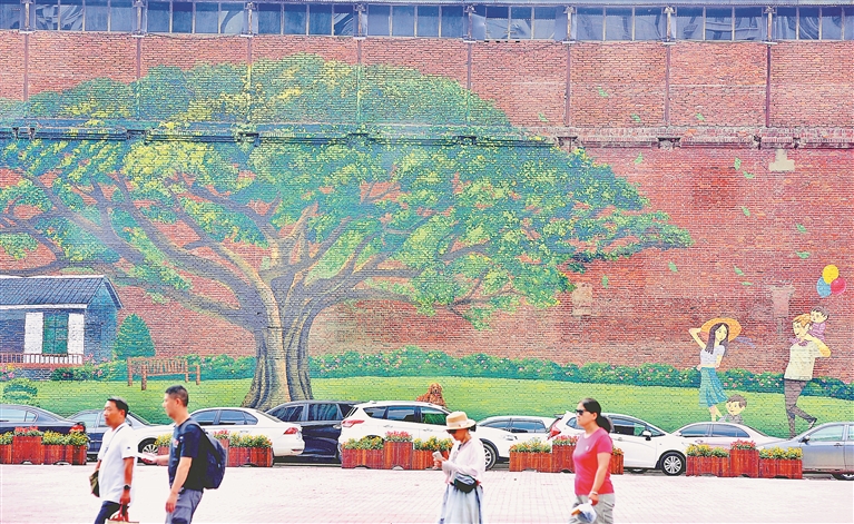 哈爾濱市道外區(qū)東直路上,路邊的花卉景觀與墻體彩繪互相映襯,成為街頭一道美麗風(fēng)景,引得人們紛紛駐足觀看。畫里的溪流、小徑、樹木、花草、動(dòng)物與畫外的綠地巧妙結(jié)合起來(lái),融為一個(gè)整體,創(chuàng)意新穎,視覺效果良好,讓人眼前一亮。