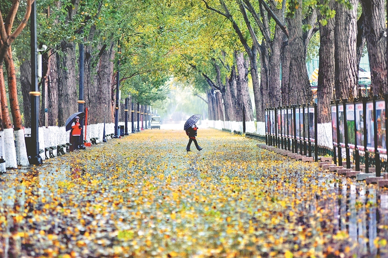 雨中秋意濃。10日一場(chǎng)秋雨,哈爾濱街道兩側(cè)的樹(shù)葉紛紛飄落,滿地落葉如同一層金色地毯,為秋日冰城增添了更多魅力。外出的人們撐起五顏六色的雨傘,走在落葉間,構(gòu)成了一幅幅美麗的油畫(huà)。