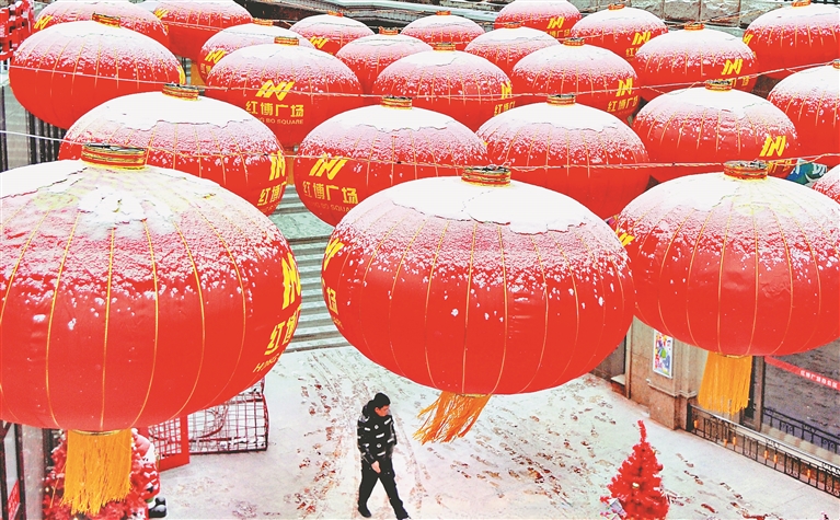7日,臘八節(jié),哈爾濱市迎來(lái)降雪天氣。在白雪映襯下,街邊和廣場(chǎng)上懸掛的大紅燈籠更顯喜慶。街上的行人紛紛拿出手機(jī)拍下精彩瞬間。在一些市場(chǎng)內(nèi),銷(xiāo)售臘八粥、臘八蒜的攤位擠滿(mǎn)了消費(fèi)者,生意十分紅火。