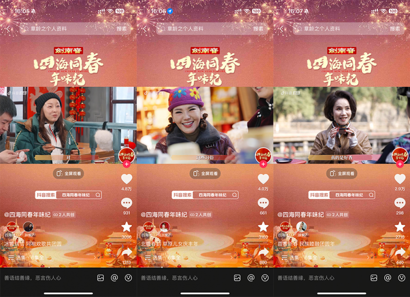 為紀(jì)念首個(gè)“非遺版春節(jié)”,由抖音出品、中國(guó)名酒劍南春冠名的春節(jié)主題紀(jì)錄片《四海同春年味紀(jì)》邀請(qǐng)多位明星來(lái)到家鄉(xiāng)或向往的城市,體驗(yàn)當(dāng)?shù)靥厣晡?。紀(jì)錄片于1月22日-1月27日,通過(guò)抖音、抖音精選、今日頭條、西瓜視頻、鮮時(shí)光等平臺(tái)播出。截至收官,該片正片播放量超1億,抖音話題播放量破2.3億,全網(wǎng)曝光達(dá)10億,相關(guān)話題多次登上平臺(tái)熱榜。