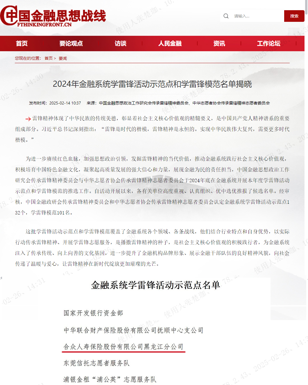 在2024年金融系統(tǒng)學(xué)雷鋒活動示范點和學(xué)雷鋒模范評選中,合眾人壽黑龍江分公司黨支部脫穎而出,成功獲評學(xué)雷鋒示范點,成為合眾全系統(tǒng)唯一獲此殊榮的單位。這一成績的取得,不僅是合眾人壽黑龍江分公司的榮耀,更是整個合眾系統(tǒng)的驕傲,為行業(yè)樹立了榜樣。