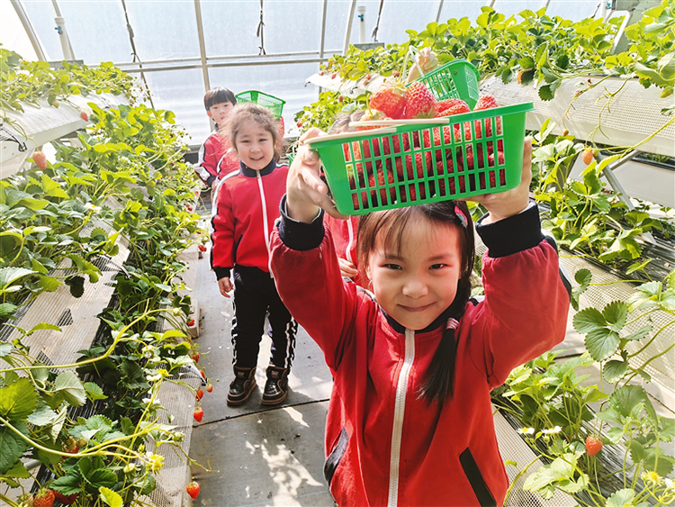在位于陽明區(qū)樺林鎮(zhèn)的唐櫻園生態(tài)農(nóng)場(chǎng)里,整齊排列著24棟智能溫室大棚。在11號(hào)草莓大棚里,來自同心幼兒園的小朋友正在采摘草莓,孩子們興奮地圍著草莓觀察,“草莓真好看,草莓好甜啊!”
