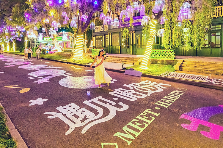 傍晚時(shí)分,通往演出現(xiàn)場的《遇見·哈爾濱》網(wǎng)紅街,也吸引了眾多游客駐足打卡。整條街道的地面,通過彩繪表現(xiàn)“浪漫”“愛情”和“遇見·哈爾濱”三大主題,滿是手繪的愛心和繽紛花朵,路兩旁的樹上還精心布置了玫瑰花束和水母燈,直接將浪漫值拉滿。游客們擺出或站、或坐、或跳起等姿勢,無需修圖,隨手一拍都是浪漫大片。網(wǎng)紅街不僅好拍,更精彩、好看。