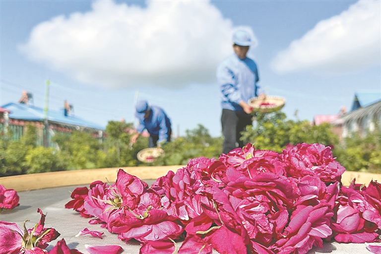 村民采摘玫瑰花。高偉攝