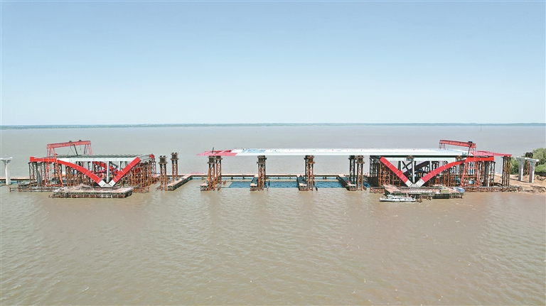 當下,北環(huán)項目全線各工區(qū)施工現場一片忙碌景象。松花江特大橋主航道拱橋的施工現場,正在緊張地進行主跨鋼梁頂推施工,備用航道斜拉橋已完成主塔交匯段施工,目前正在進行上塔柱施工。與此同時,引橋正在進行墩柱、蓋梁及梁板安裝施工。項目主線上,路面水穩(wěn)基層正在施工,排水防護多作業(yè)面同步推進。