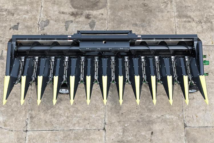 現(xiàn)場(chǎng)會(huì)上,最讓人駐足的是現(xiàn)場(chǎng)展示的意大利卓收割臺(tái), 此次引入的卓收割臺(tái),其自動(dòng)摘穗板每行單元可實(shí)現(xiàn)自動(dòng)開(kāi)合且?guī)в袦p震功能,能根據(jù)玉米粗細(xì)靈活調(diào)節(jié)間隙,有效解決了其他品牌割臺(tái)無(wú)法對(duì)每行每株精準(zhǔn)適配的問(wèn)題;同時(shí),收割臺(tái)的拉莖輥長(zhǎng)度較其他品牌割臺(tái)增加 8 公分,讓割臺(tái)更貼合地面,在收獲倒伏玉米時(shí)作業(yè)角度更優(yōu),大幅減少 “跳棒” 現(xiàn)象。此外,卓收割臺(tái)的拉莖輥及刀片采用螺栓固定設(shè)計(jì),可隨時(shí)調(diào)整位置或更換部件,避免了其他割臺(tái)因拉莖輥及刀片為一體式設(shè)計(jì)、損壞后需整體更換的弊端。
